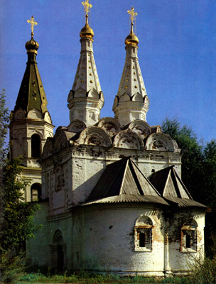 Бывший княжеский двор в кремле после присоединения Рязани к Москве стал активно застраиваться культовыми постройками с 40-х годов XVII в . Одной из первых таких построек была Духовская церковь в старом монастыре XV веком во имя Св. Духа. Связанная формами с прежним XVI веком, церковь имеет два высоких шатра. Ее строитель, талантливый зодчий из Солигалича Василий Зубов, повидимому был удовлетворен своей постройкой, во всяком случае, он заложил в церкви камень с указанием своего имени. Церковь всегда впечатляла зрителей своей тонкой красотой, а наружные детали храма не перегружены декоративными элементами, как это часто видим в одновременных других постройках.