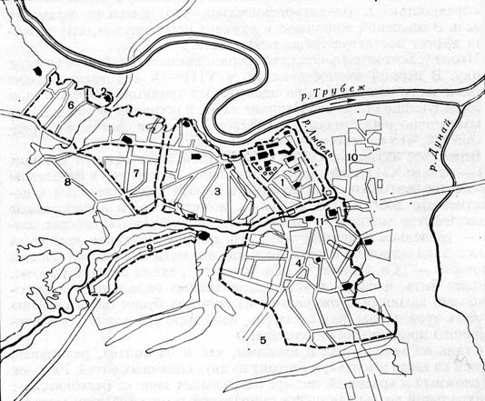 Наиболее ранний план города Переяславля-Рязанского датируется временем, начиная с XV века. Первые летописные сведения говорят о том, что уже на рубеже XIII — XIV веков он уже был значительным городом и имел крепость. Он был основан на высоком мысу между реками Трубежем и Лыбедью, где поныне находится рязанский кремль. Южнорусское (повидимому, черниговское) происхождение основания города отразилось в названиях и города, и его рек: Трубеж, Лыбедь, Дунайчик. Два древних монастыря — Спасский, XIV века, и Духовский, XV века, — были первоначальными своеобразными границами крепости-кремля. С юга и запада к кремлю примыкали посады, еще западнее, за «черным посадом», вольно раскинулась «владычная» слобода, именовавшаяся Борисо-Глебской. На берегах речки Лыбедь располагался торг города, со сходившимися к нему дорогами на Старую Рязань, Пронск, Владимир, здесь же неподалеку начинался и путь на Москву.