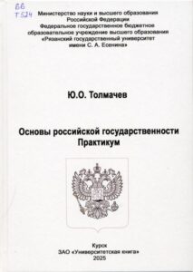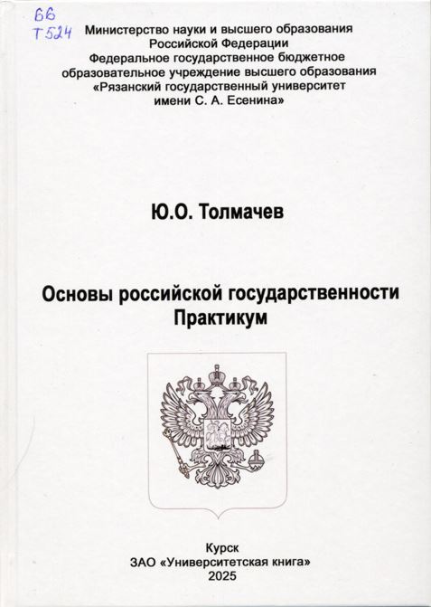 Основы российской государственности : практикум : учебное пособие / Ю. О. Толмачев ; РГУ имени С. А. Есенина. – Курск : Университетская книга, 2025. – 120 с. – Доступ к электронному ресурсу в личном кабинете читателя НБ РГУ. — То же электронный ресурс – URL: https://library.rsu-rzn.ru/marc/MObjects.asp. – Библиогр.: с. 91-119. – ISBN 978-5-00261-485-1. – Текст (визуальный) : непосредственный + Текст (визуальный) : электронный.