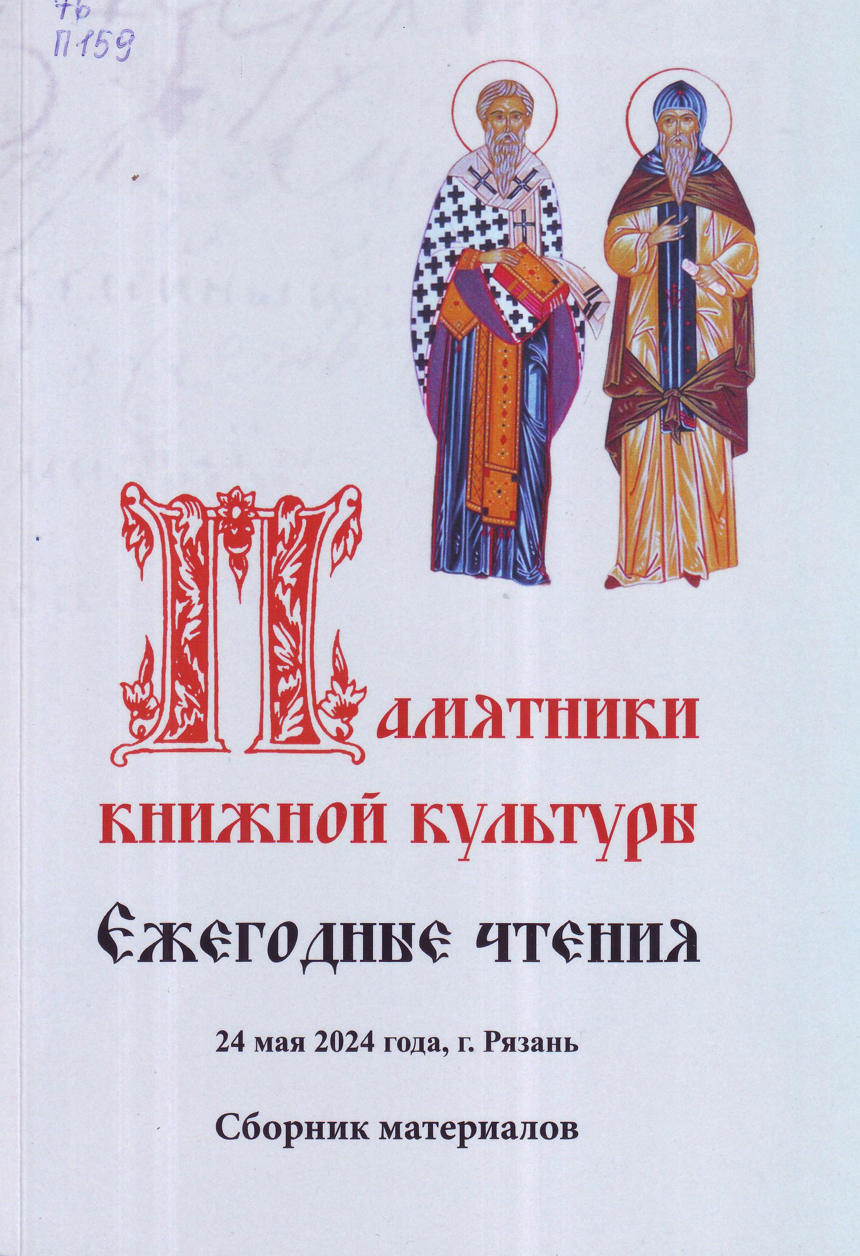 Памятники книжной культуры : ежегодные чтения (24 мая 2024 года, г. Рязань) : сборник материалов / Министерство культуры и туризма Рязанской области, Рязанская областная универсальная научная библиотека имени Горького. – Рязань : Библиотека имени Горького, 2025. – 192 с. – ISBN 978-5-6052174-5-9. – Текст (визуальный) : непосредственный.